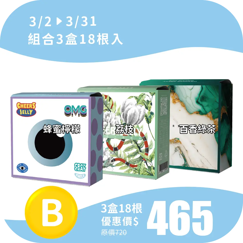 CHEERSJELLY【春日時光 B】舉杯低卡蒟蒻凍(3盒共18根入)蜂蜜檸檬 荔枝 百香綠茶